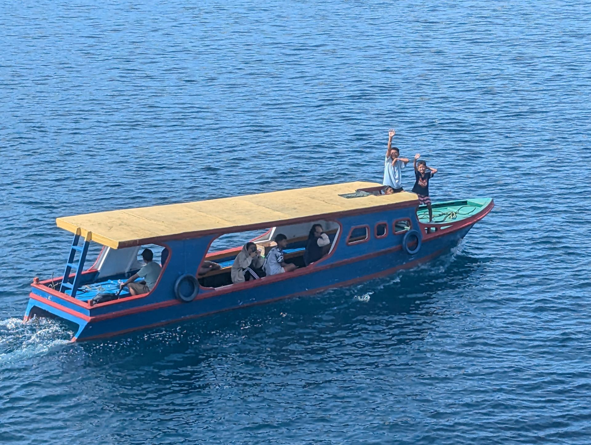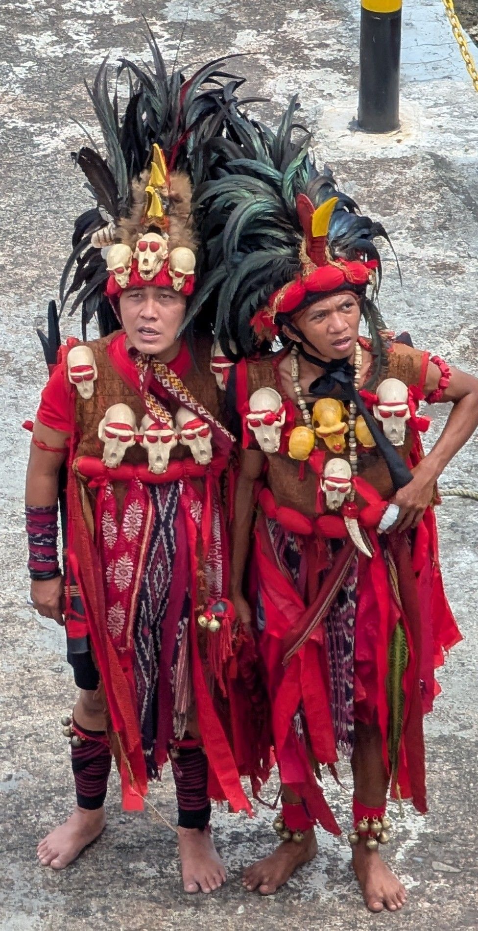 Men with cars and larger boats offer trips to the jungle interior and private island beaches and weep when a passenger pays more than they expect. The exchange rate here is the most extreme we have experienced yet. One dollar equals 16,600 rupiah. Still, the children run to you and smile, delighted when you take their picture. Adults with cameras want "selfies" with you, and with the cruise ship. Some local ladies bring their offerings of crafts and food to sell at the temporary stalls set up near the ship. It is obvious that most of the population here is challenged with various degrees of poverty.