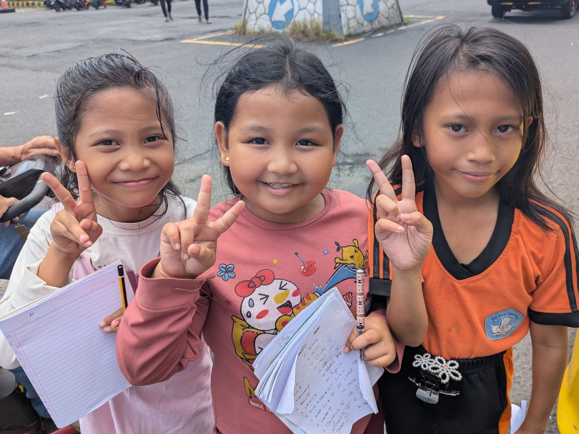 When we walk into the town beautiful excited children greet us everywhere. The very little girls touch my hands, kiss them, then press their tiny hands together in prayer. Some older children wear school uniforms and backpacks. They want us to sign their notebooks and write down where we come from.