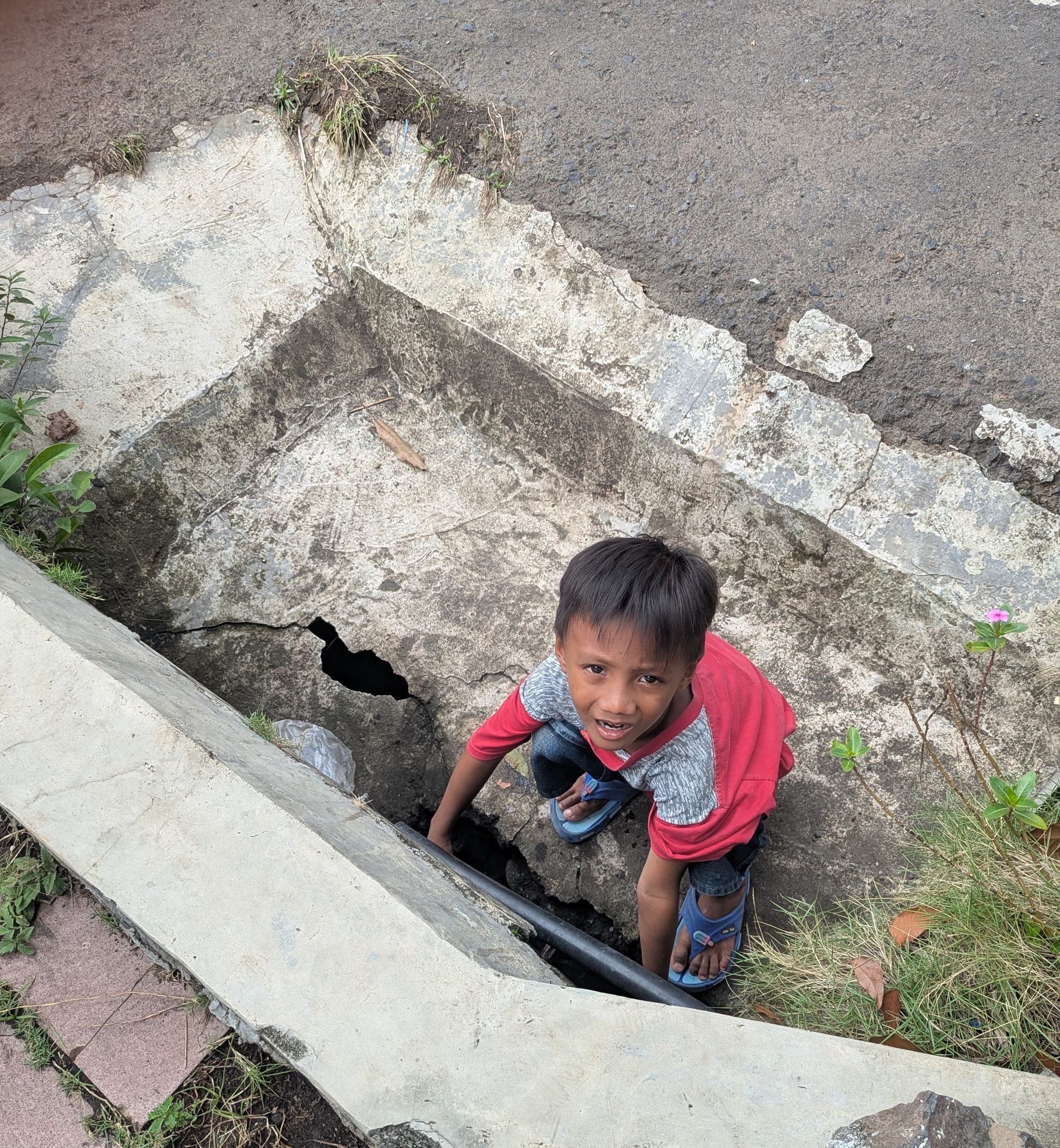 Walking through the city of Bitung, we see poverty, crumbling houses and sidewalks. A Starbucks on one corner, is an out of place foreign oasis of air-conditioning and expensive coffee. No recent upgrading of infrastructure, shops or other buildings, only essential patching and trees are breaking through the sidewalks.
