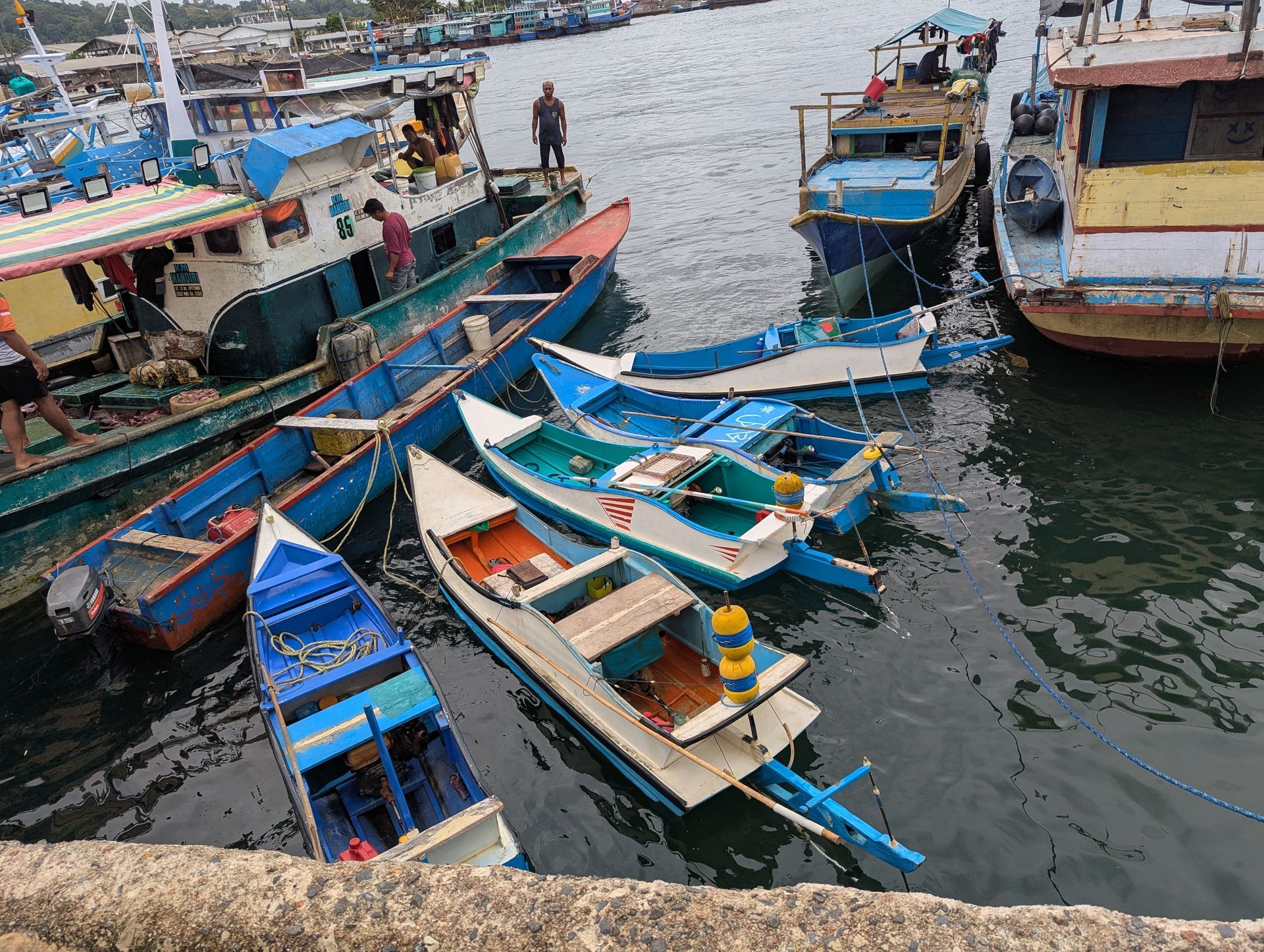 Other children not in uniform are also very friendly and seem left to their own devices. They follow, watch us and with one or two words of English, ask questions then drift off. A very few will brush their fingertips together asking for money. Compared to other countries we have seen so far, there is very little begging though there are homeless adult men. Two young boys are fishing with hand lines, in a drainage ditch that runs beneath the sidewalk. Next to them a small outdoor grill is set up where a woman governs over her tiny open lunch spot, a table and several chairs. The boys are providing her with fish to cook. They are collected in a metal bowl of water on the ground by the grill.