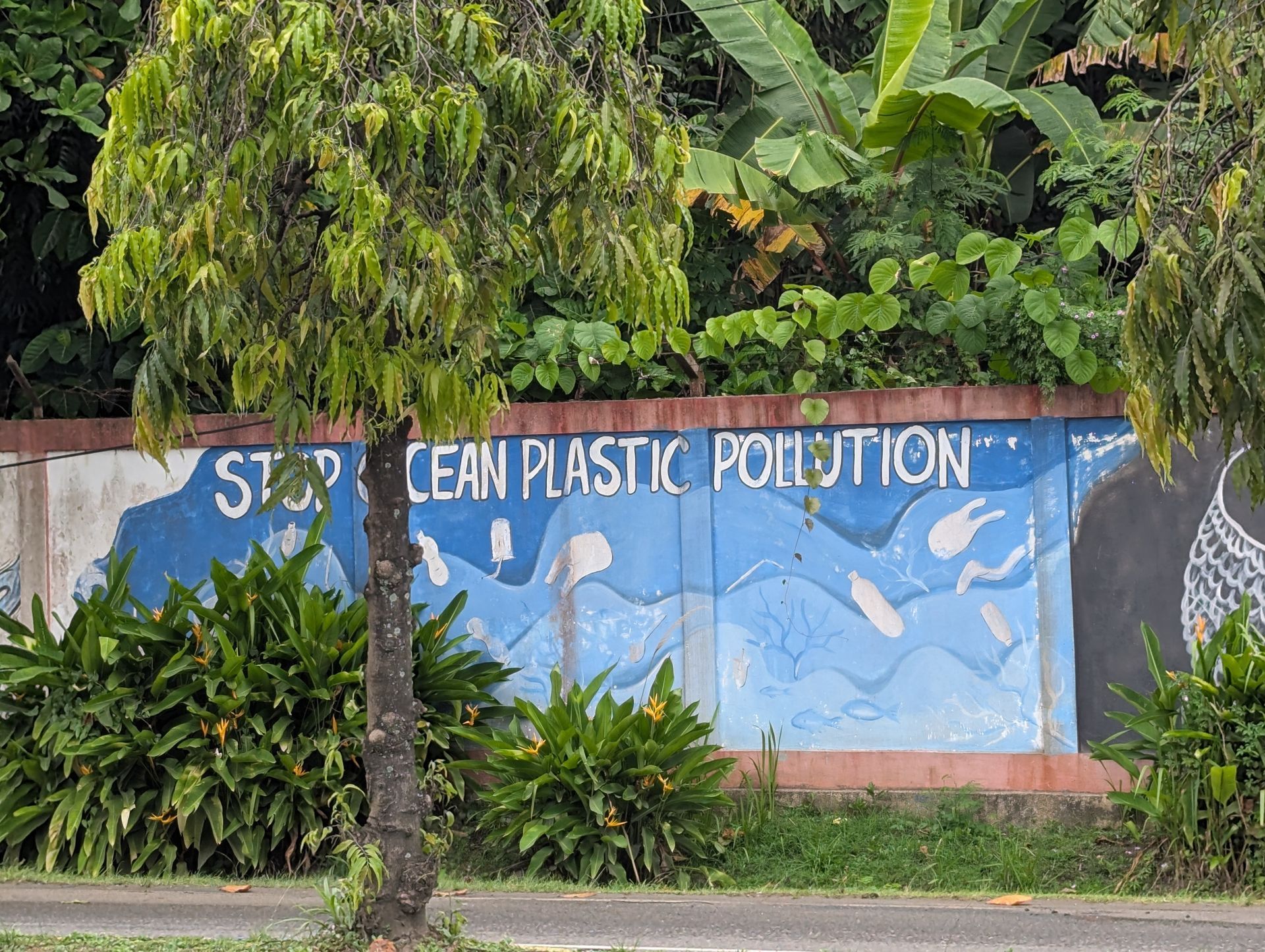 Indonesia is not yet able to provide basic needs and sanitation for its existing populations. Garbage is everywhere, some swept into piles and baskets. The dumpster is overflowing and heavy rains which are frequent, wash huge amounts of trash into the water creating a mosaic of color and texture made up of plastic bags, straws, plastic wrappers, lids, cardboard boxes, yogurt cups, styrofoam food boxes and the occasional tractor tire. The unfortunate effects of this pollution are locally understood, graffiti on a wall sounds a warning.