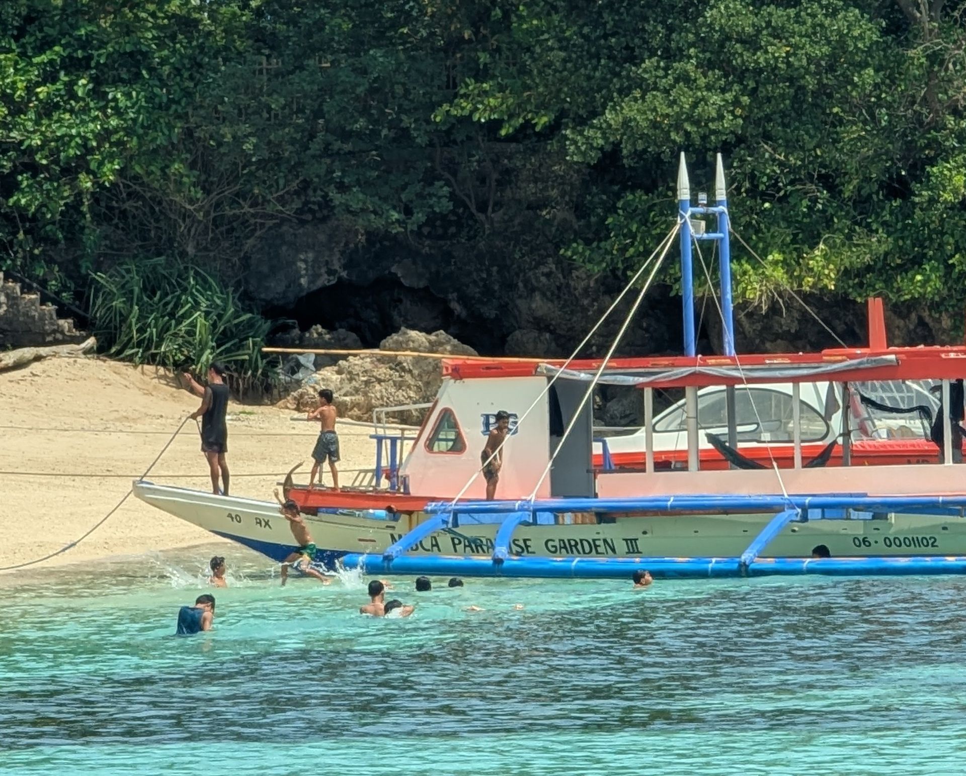 As a coconut passes in the turquoise water bobbing in its rings of silver, I suddenly notice a group of youngsters. In spite of poverty and their deteriorating environment children find fun and are irrepressible in their desire to play. I watch as a group of young boys swim out enthusiastically to an approaching tour boat, their skinny arms flailing in competition. They climb onto its outriggers even before it reaches shore, leap from them, shouting and laughing, over and over, delighting in their youth and energy.