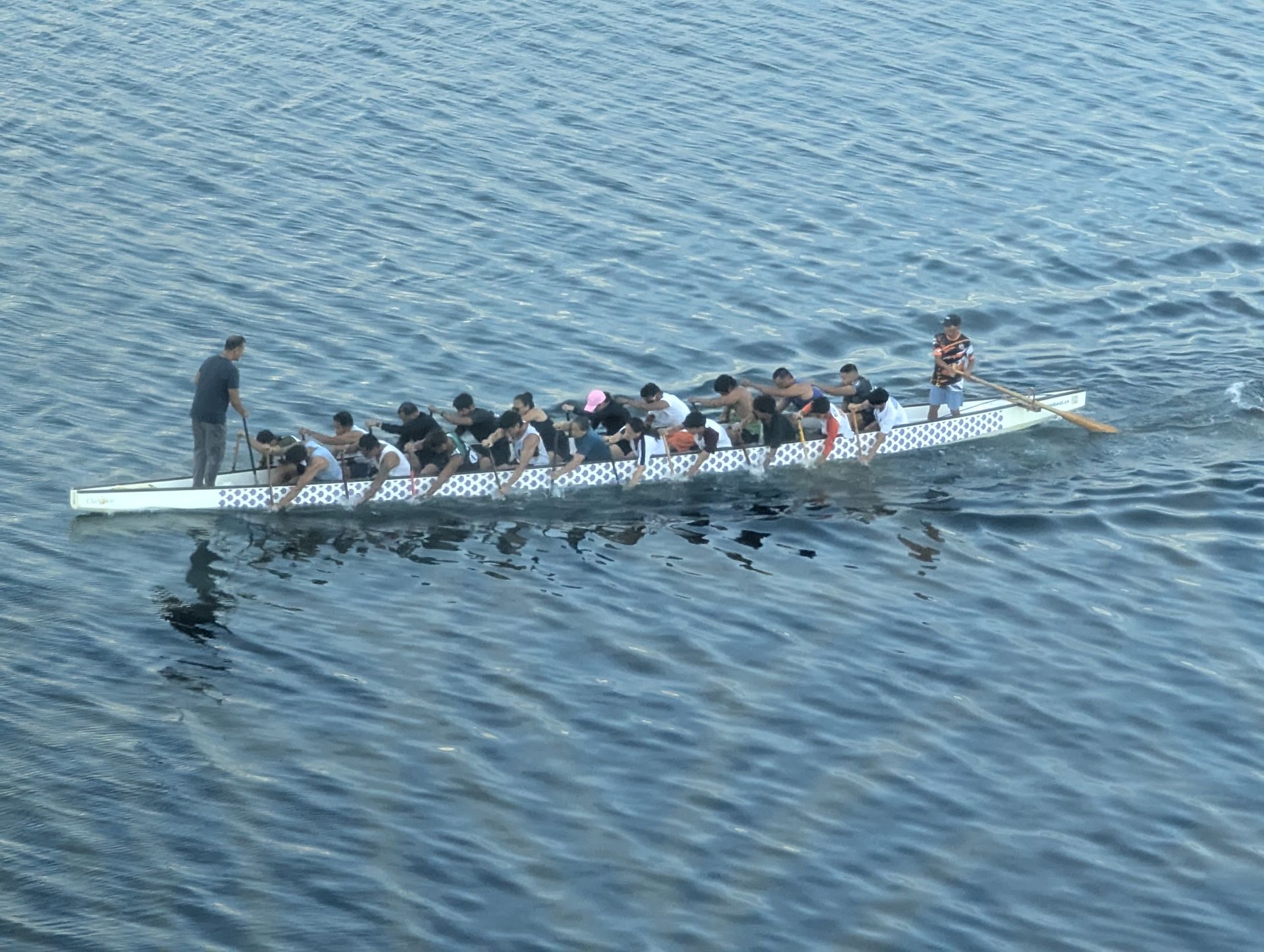 I walk along the edge of the harbor. A concrete breakwater slopes down to the water. Sitting in a narrow boat, a man is chipping oysters off it with a hammer and chisel, to sell at the bars along the waterfront in the evening. The distinctive brightly colored boats are everywhere, long and narrow with a sharp uplifted prow. They resemble water beetles when they are moving. Their outriggers touch off disturbance on the surface, like the spidery legs of the beetle as it scoots here and there. Occasionally you see a longer boat paddled by several people on either side with one person standing on the bow counting the rhythm. Viewed from the stern, as the boat reseeds, the paddles give the effect of heaving in and out like an animal breathing hard. It is a dragon boat.